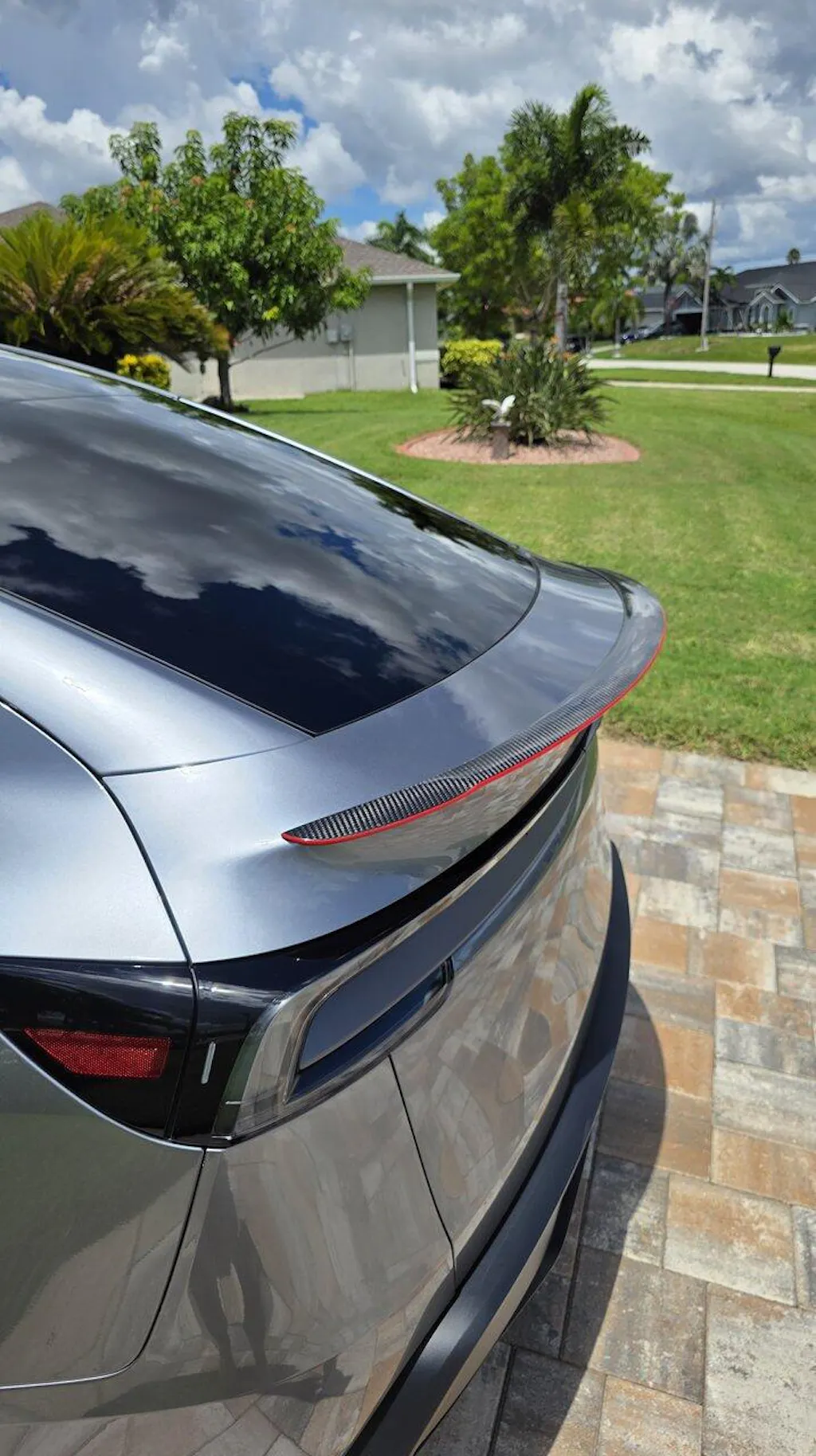 The EVBASE trunk spoiler in glossy redline carbon fiber! Subtle and sporty with a little kick up top! True to the EVBASE‘s no-damage installation, the spoiler is easy to install with the best fitment for any Model 3 Highland and Model Y Juniper trunk spoiler. Attaches with double-sided tape that is already adhered to the spoiler!