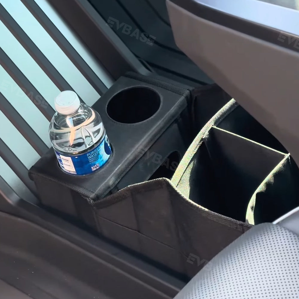 The nice-sized bag with compartment separators seamlessly integrates into the lower armrest area. It's a game-changer for using the dead space below the console